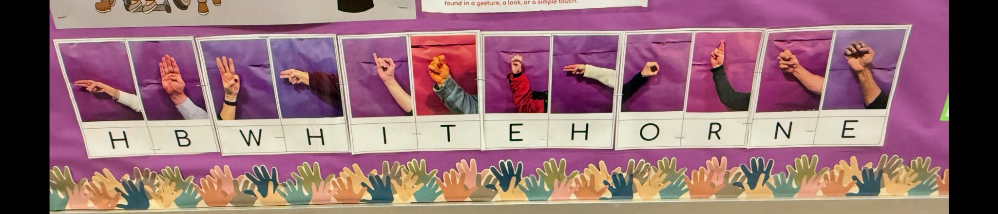 At HBW, staff were provided with different YouTube videos, activities, and TED Talks. Ms. Sewell, her students, and paras created a school-wide bulletin board and Ms. Albano ran a door decorating contest! Ms. Qin also created a wonderful bulletin board and worked with Ms. Kleinknecht on a collaborative lesson on inclusivity. Ms. Qin also celebrated the Lunar New Year with an exploration of Chinese culture and a New Year celebration with the Chinese Club. Additionally, Ms. Thomas created a bulletin board spelling out “H.B. Whitehorne” in sign language.