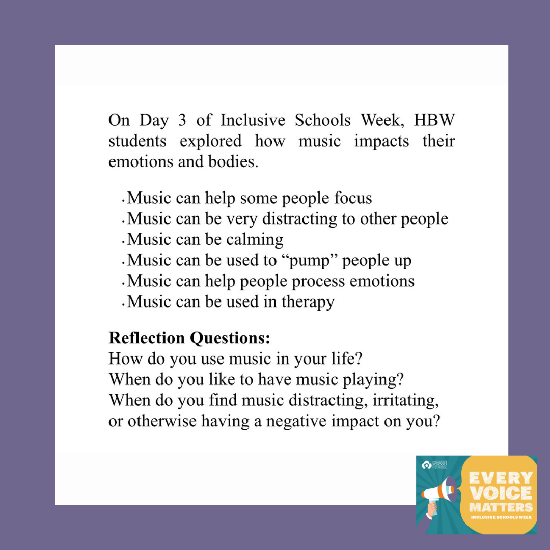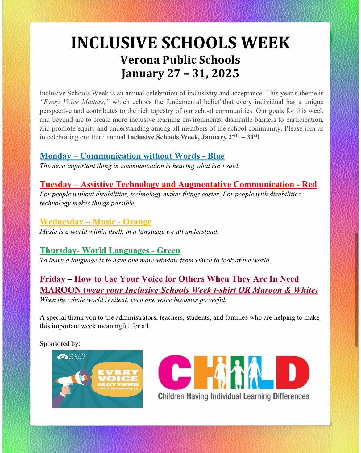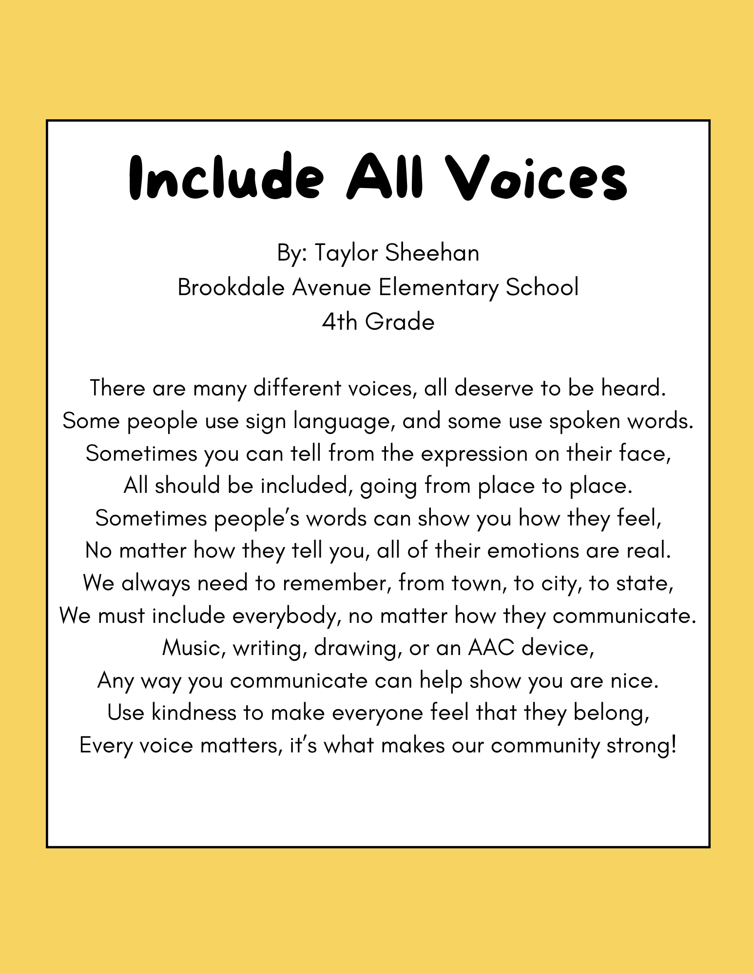 Inclusive Schools Week is an annual celebration of inclusivity and acceptance. This year’s theme was “Every Voice Matters,” which echoes the fundamental belief that every individual has a unique perspective and contributes to the rich tapestry of our school communities. The focus of the week was communication. The curriculum focused specifically on communication without words, assistive technology and augmentative communication, music, world languages, and how to use your voice for others when they are in need.