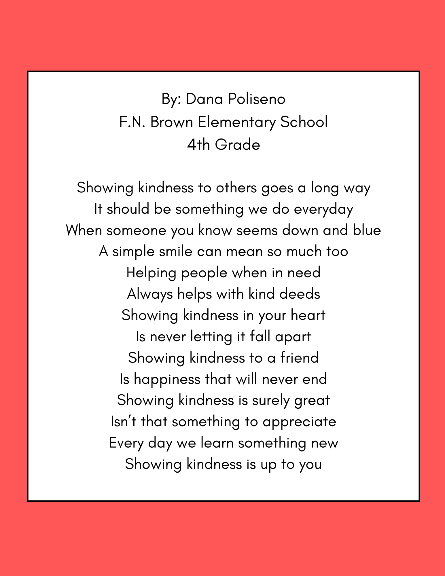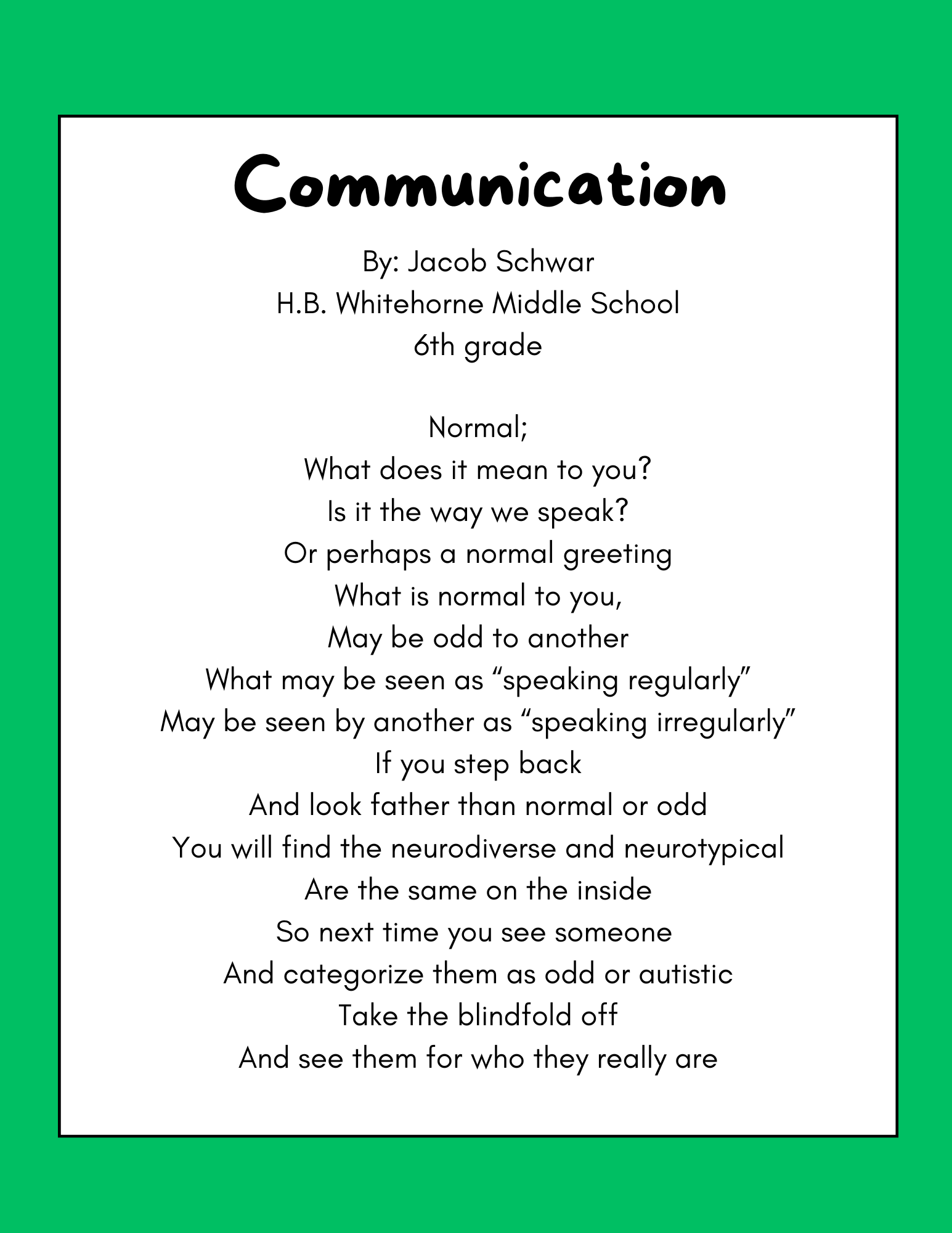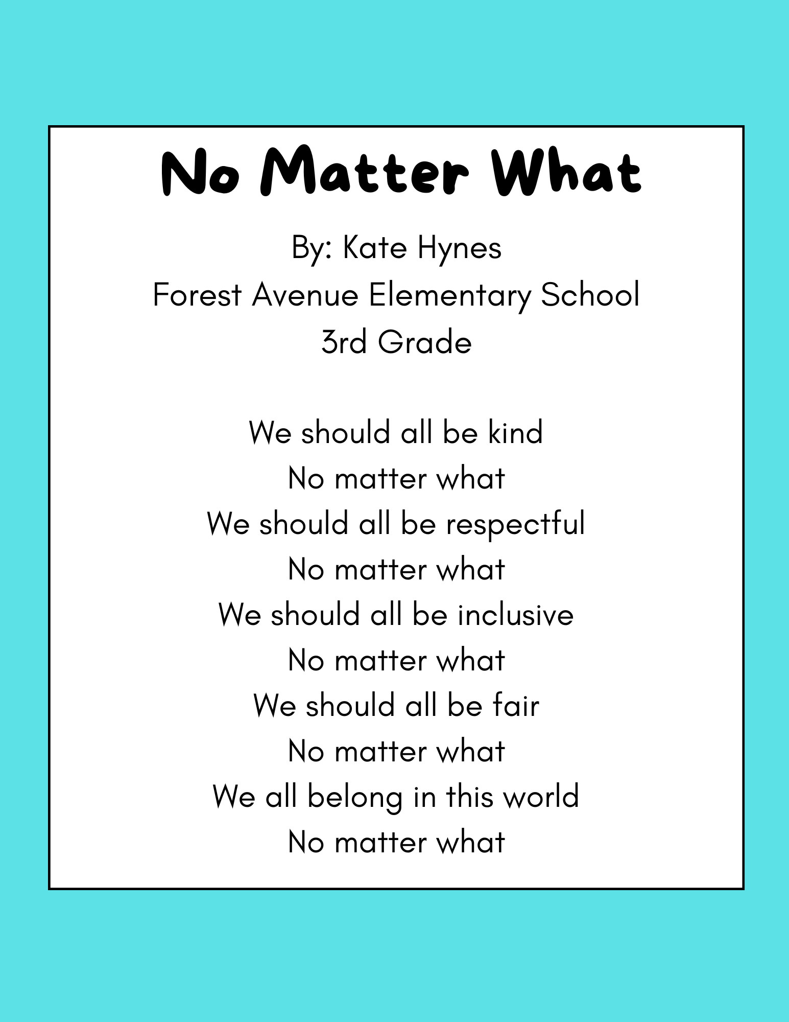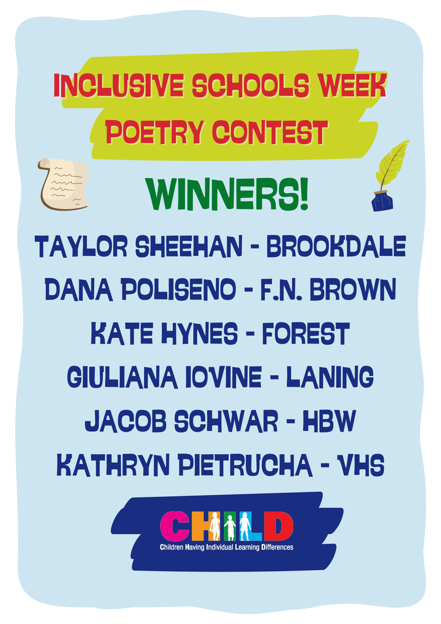 The Inclusive Schools Week Poetry Contest was also a big success with 137 poems being submitted across the district! Our Board was very impressed with the hard work and time that went into each submission. At our Open SEPAC Meeting on March 12, we recognized the winners with a certificate and monetary award. The winners are: Taylor Sheehan (Brookdale Avenue Elementary School); Dana Poliseno (F.N. Brown Elementary School); Kate Hynes (Forest Avenue Elementary School); Giuliana Iovine (Laning Avenue Elementary School); Jacob Schwar (H.B. Whitehorne Middle School); and Kathryn Pietrucha (Verona High School).