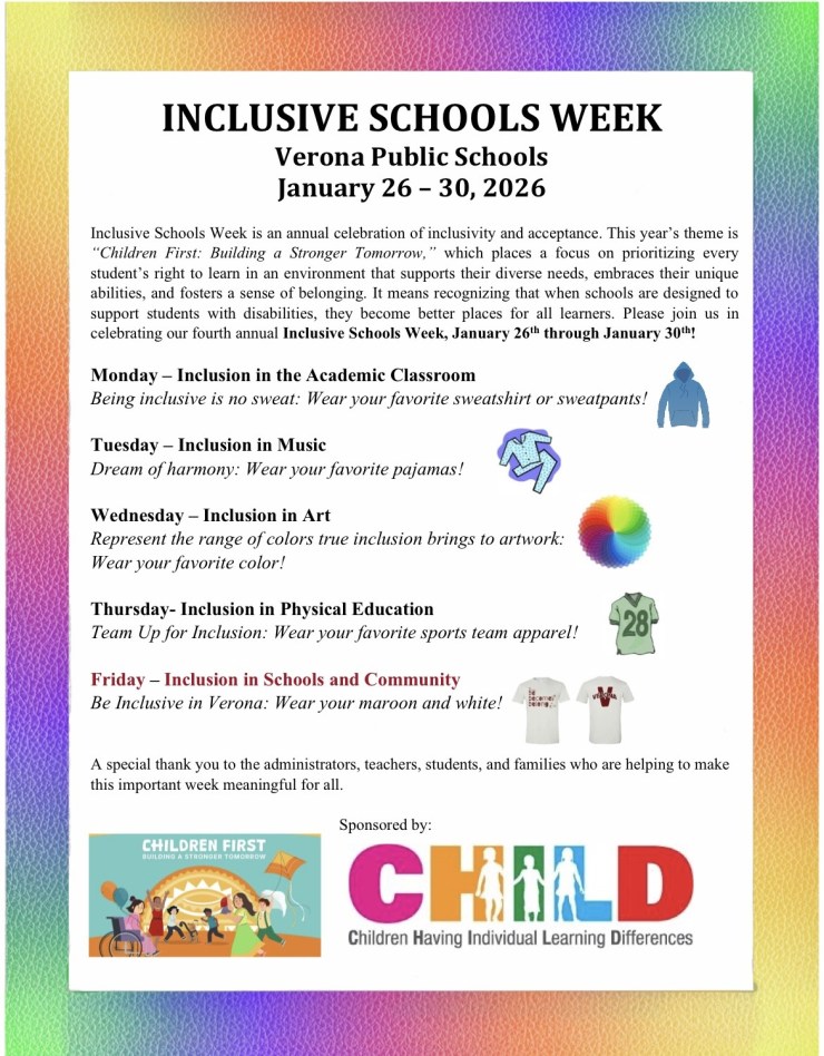 At Verona High School, staff and students were provided with a series of TED Talks. The student-run club VHS Connect spearheaded activities throughout the week, culminating in a bake sale on Friday. Members interviewed fellow students about inclusion, created posters and playlists highlighting famous artists and musicians with disabilities, and designed Canva posters for athletic teams to share on team Instagram pages to promote awareness. VHS Connect is led by Lori Hempel, with the support of advisors Dr. Shapiro, Mrs. Diaz, and Mrs. Bayram.