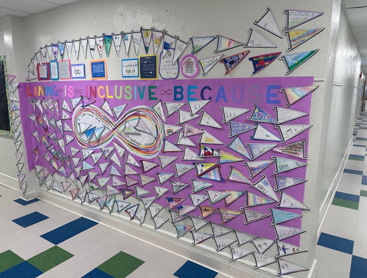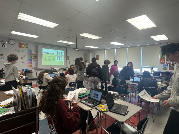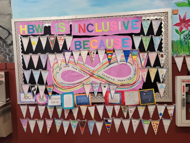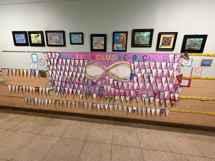 At H.B. Whitehorne Middle School, staff were provided with YouTube videos, activities, TED Talks, and adaptive art tools. Ms. Sewell, her students, and paraprofessionals helped create the school bulletin board. Ms. Kleinknecht guided her students through an Inclusive Schools Week gallery walk highlighting notable individuals with disabilities. Ms. Qin created a bulletin board and led activities in her Mandarin classes. Art teacher Ms. Mustardo introduced students to adaptive art tools and plans to incorporate them into future projects.