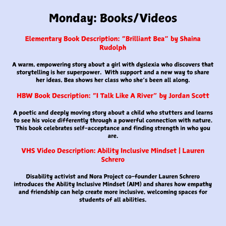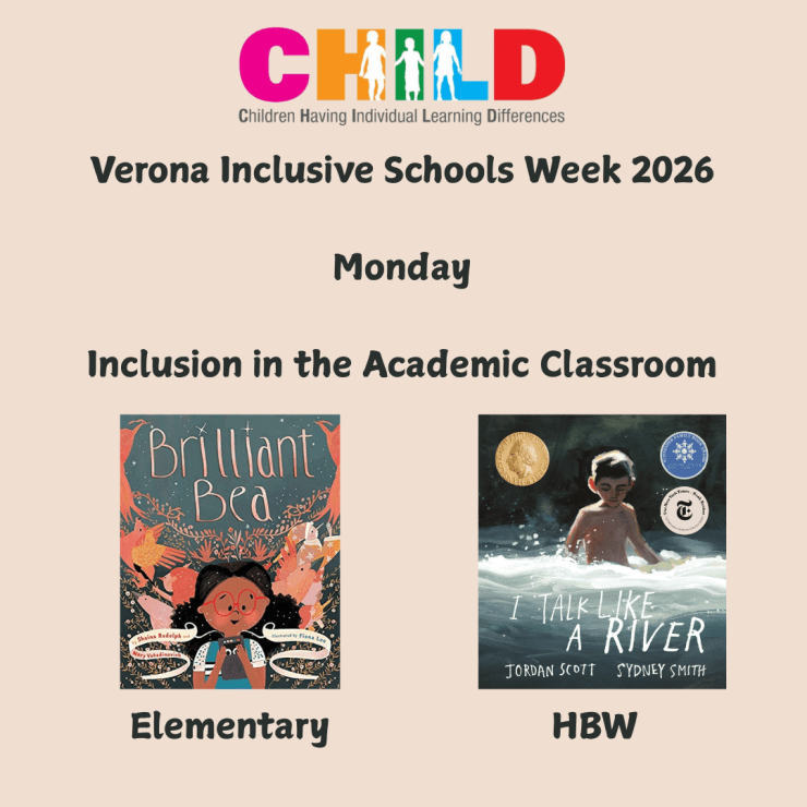 At the elementary level, C.H.I.L.D. provided all four schools with materials to create an Inclusive Schools Week bulletin board. Teachers were given video links to picture books, as well as daily lessons and activities. Librarians Ms. Walker and Ms. Freda received picture books for each school. Some of the titles donated included Unbound: The Life and Art of Judith Scott by Joyce Scott and Brie Spangler, This Is How We Play: A Celebration of Disability and Adaptation by Jessica Slice and Caroline Cupp, I Am We: A Book of Community by Susan Verde, Marvelous: An Inclusive Kids Book Celebrating a Child with ADHD by Alexandra Hoffman, and Brilliant Bea: A Story for Kids with Dyslexia and Learning Differences by Shaina Rudolph.